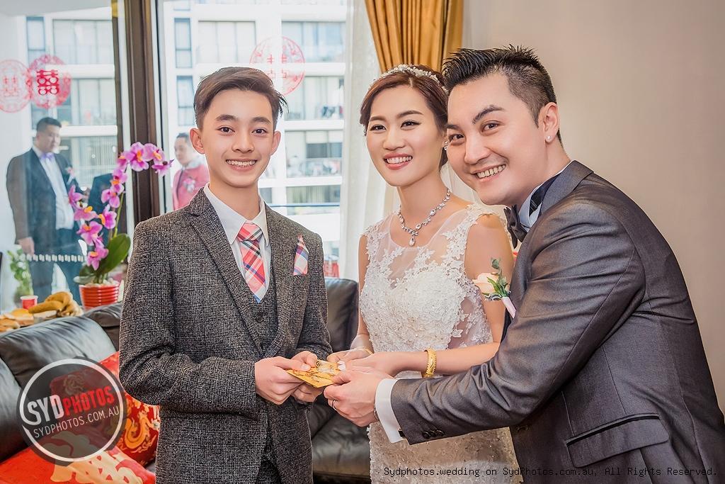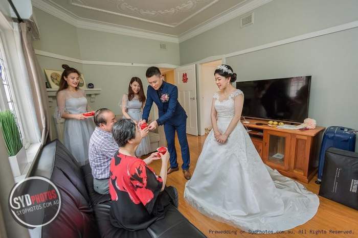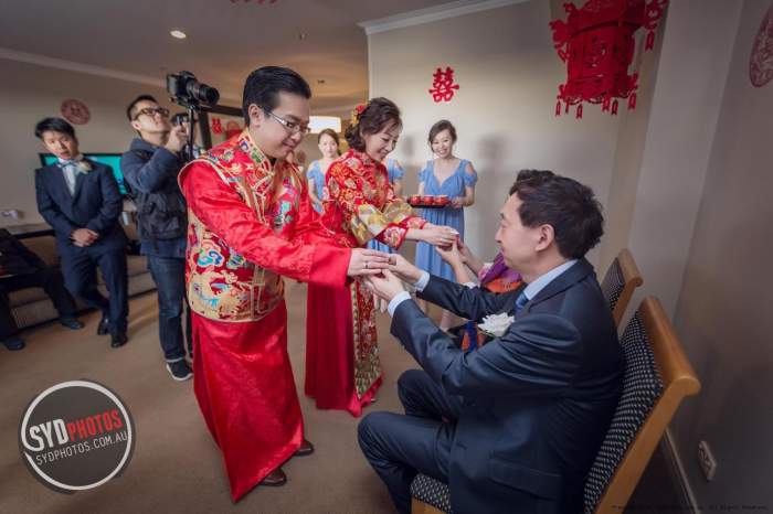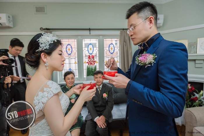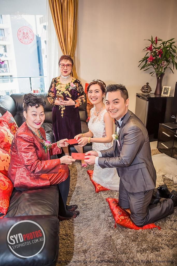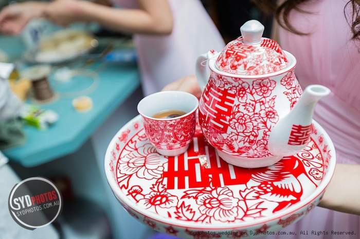 3. 新娘进门后,要向男家家中所有亲属敬茶,即使是几岁小孩也有份儿,次序按辈份年岁而定,敬茶时,长辈会送赠金器给新媳妇。而向女性长辈敬茶时,会将一个发夹夹在长辈的头发上,并回赠一只戒指。