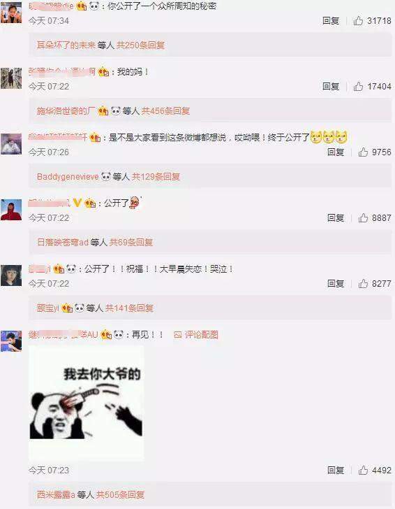 网友们在评论区开玩笑祝福:“终于在一起了,爱你们”、“祝福你啦,你应该拥有全世界全宇宙最好最甜的爱情”、“终于秀恩爱了!!!!早上的狗粮真好吃”、“一大早上起来就被喂了狗粮”,同时也有张继科的小秘密表示失望。